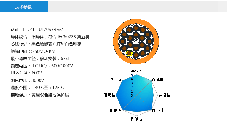 良好的耐折彎,抗扭曲;超高的柔性和使用壽命;可接觸各類含礦物油成分的潤滑劑、稀釋劑、堿水溶液及其他化學(xué)介質(zhì);具備優(yōu)異的耐候性、耐磨性、耐油性; 適用于工業(yè)機器人;